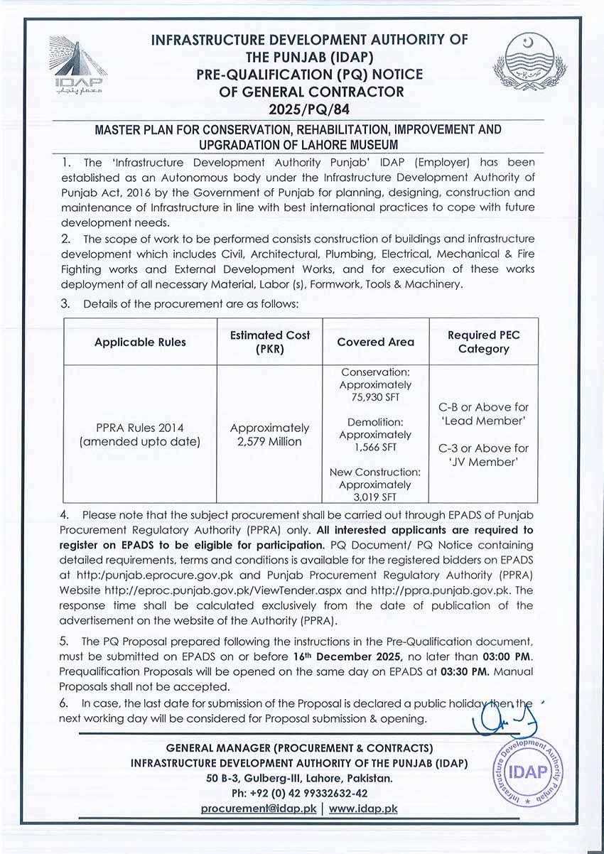 Request for Pre-Qualification of General Contractor for Secretariat Office Building & Allied Works in Multan