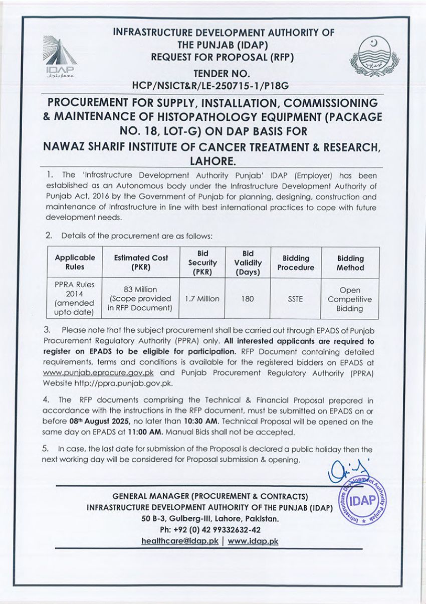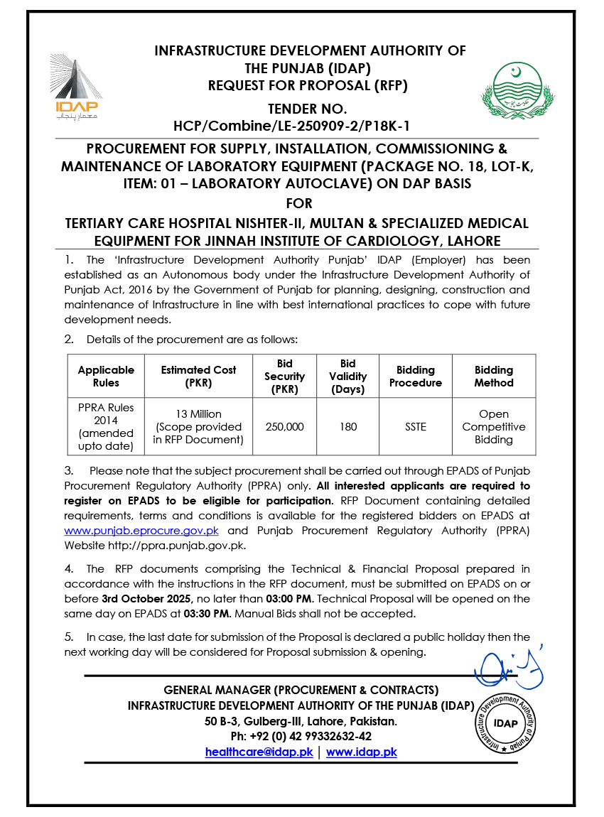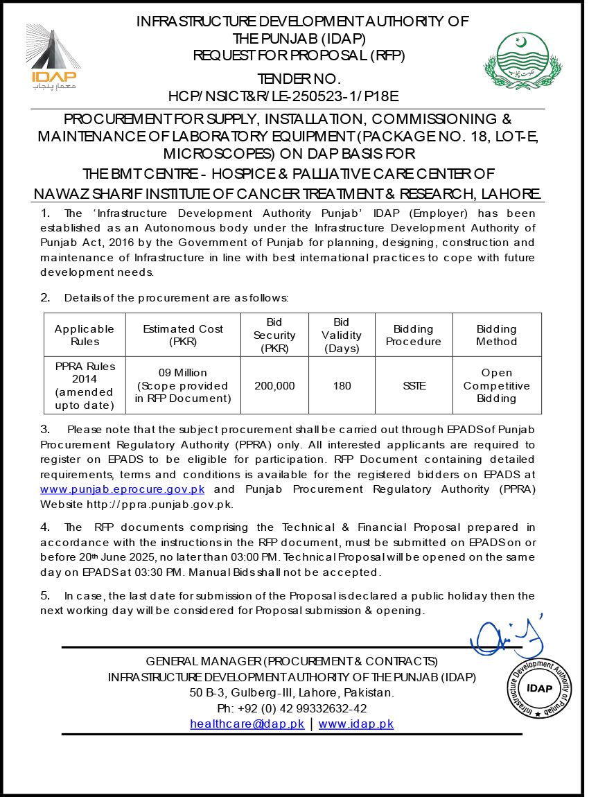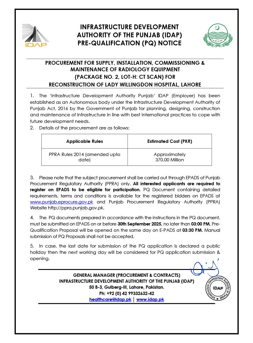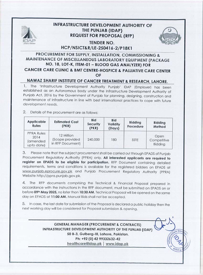 Supply, Installation, Commissioning & Maintenance of Various Medical Equipment For PKLI, Lahore