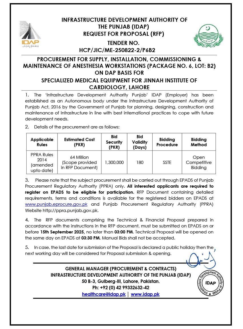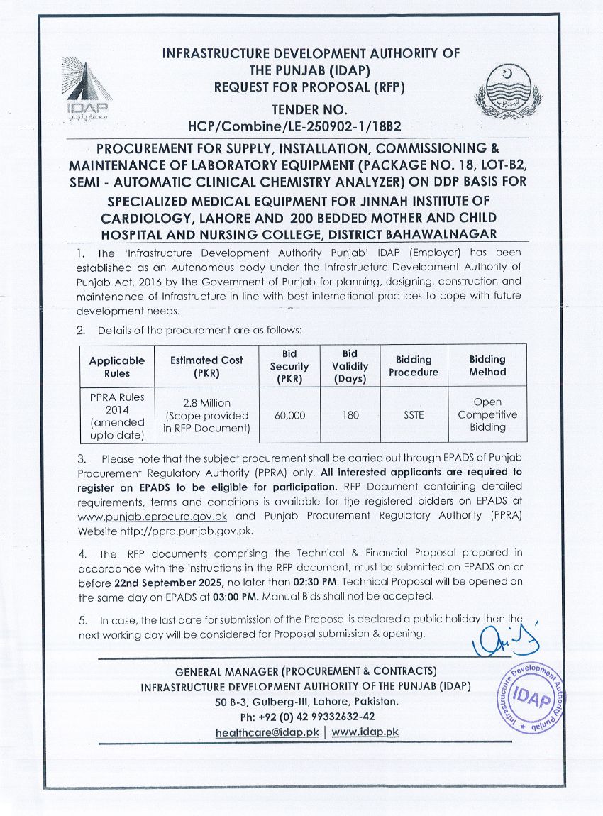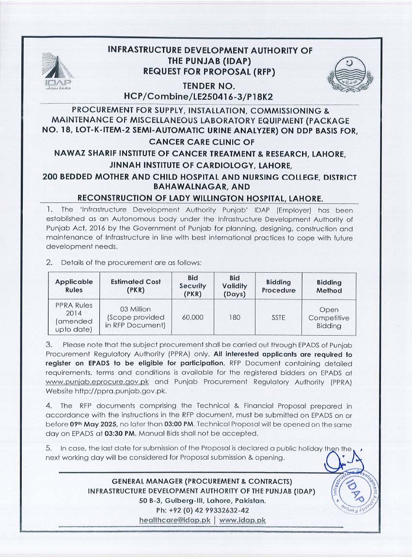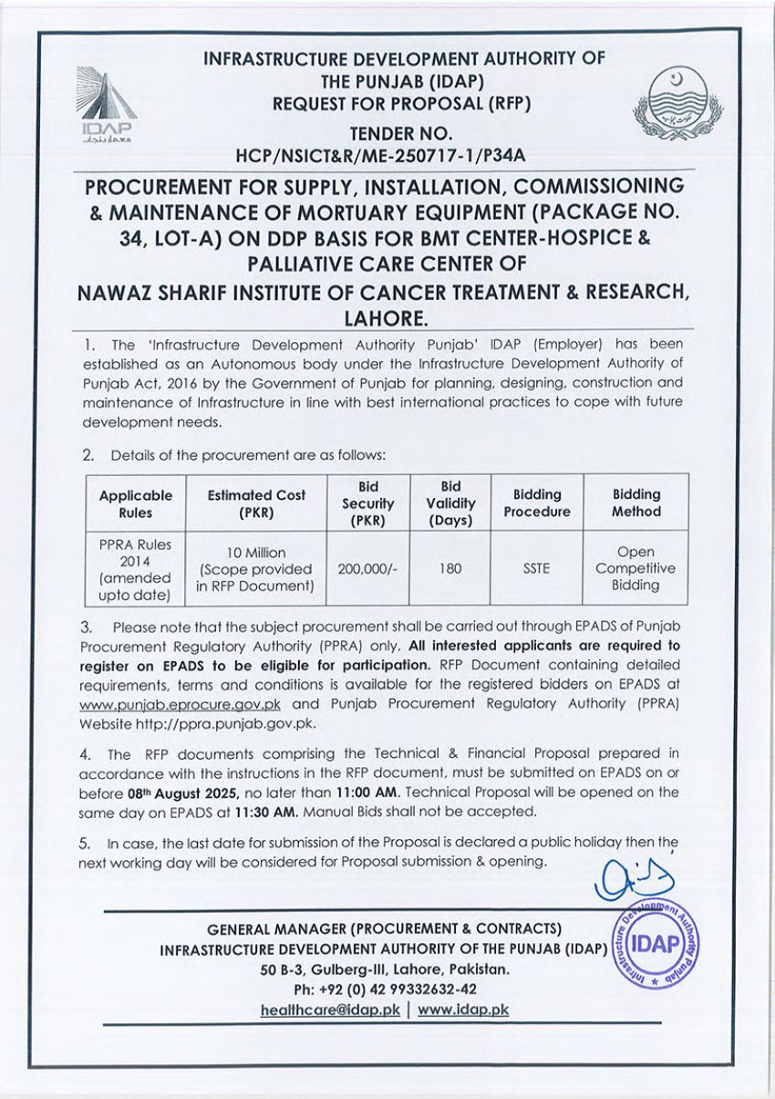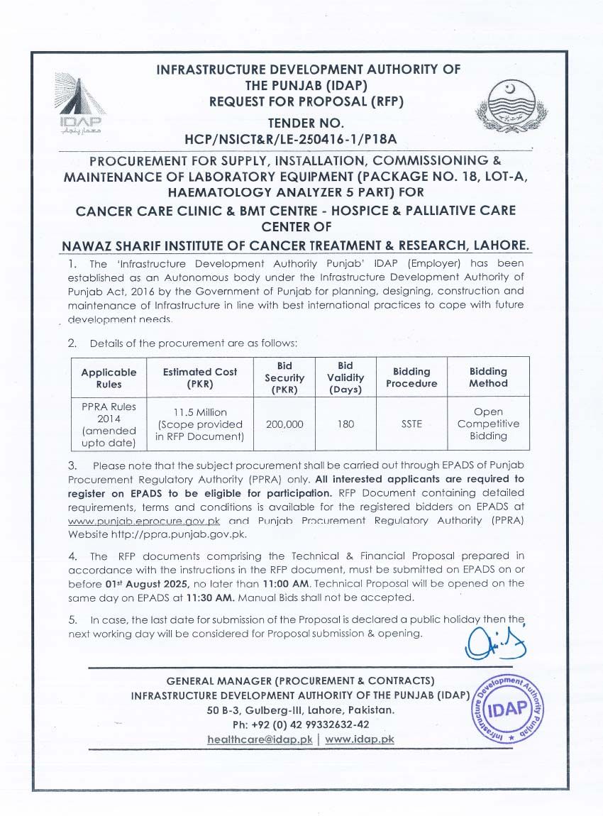 Supply, Installation, Commissioning & Maintenance of Various Medical Equipment For PKLI, Lahore