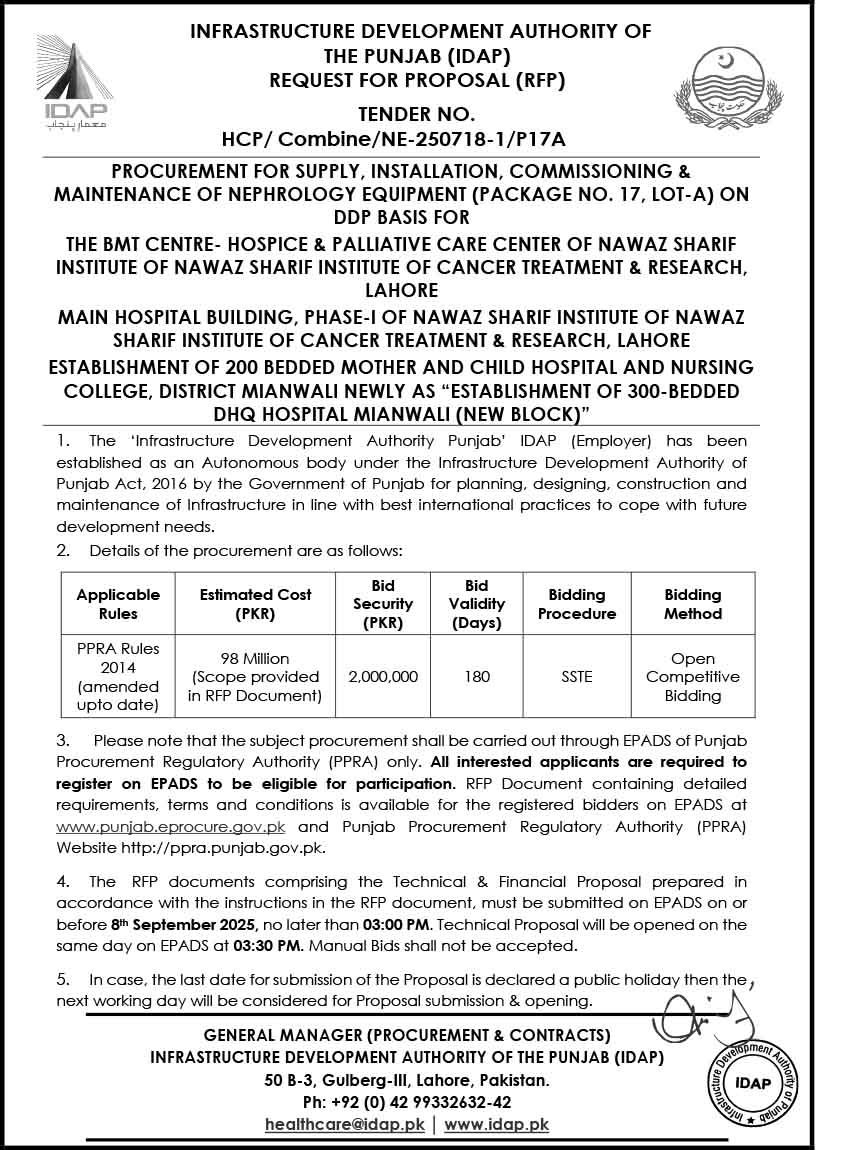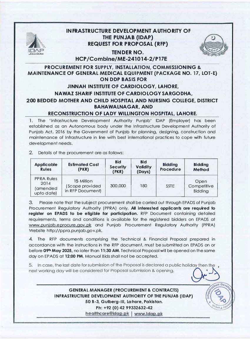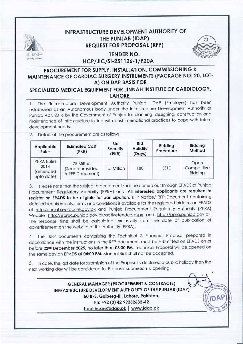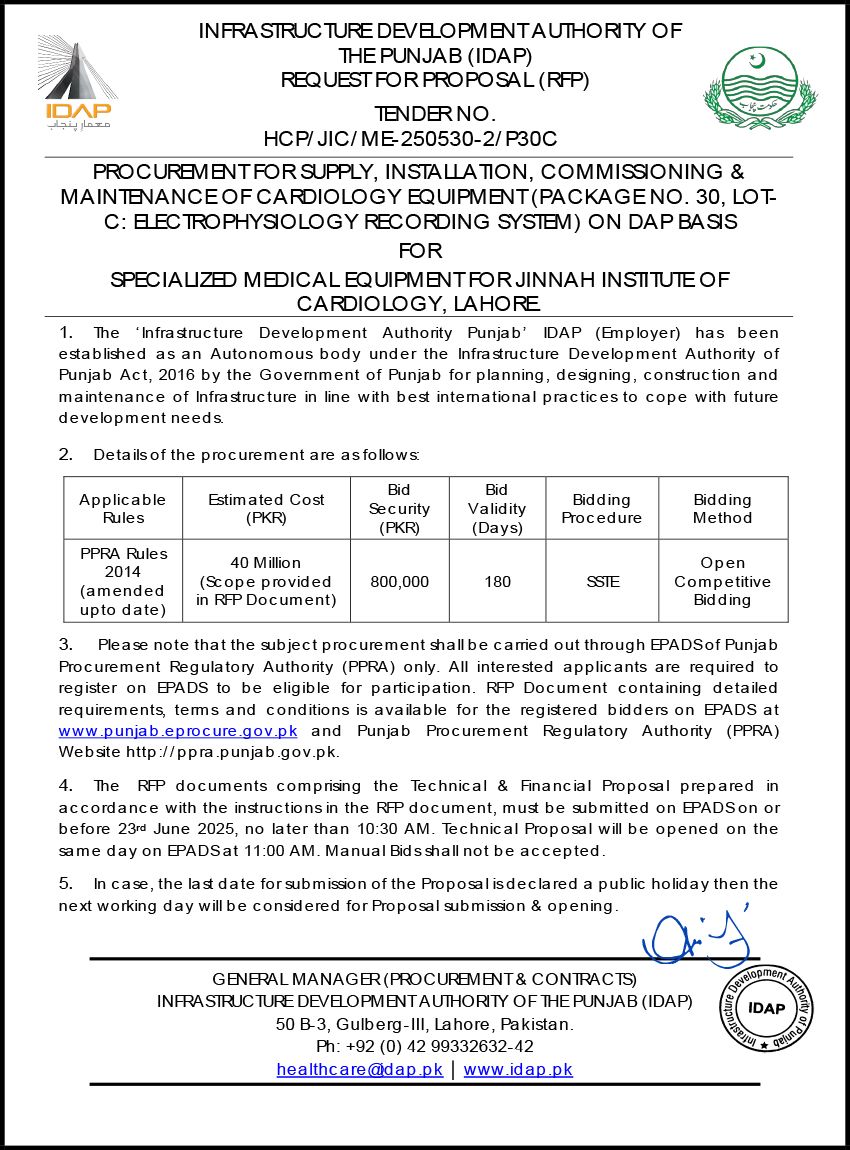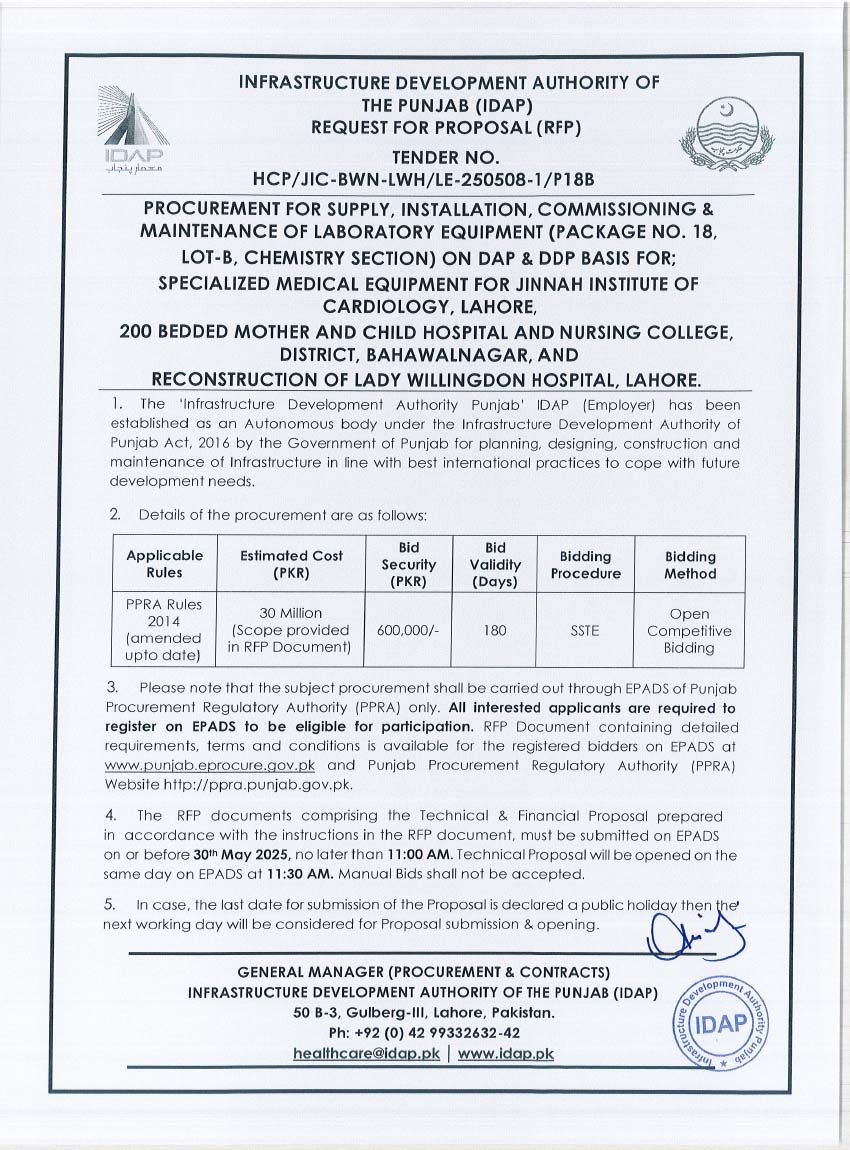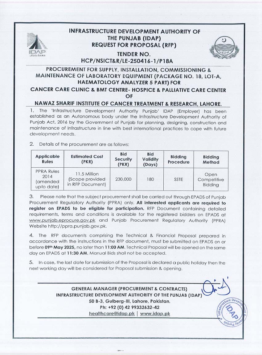 Supply, Installation, Commissioning & Maintenance of Various Medical Equipment For PKLI, Lahore