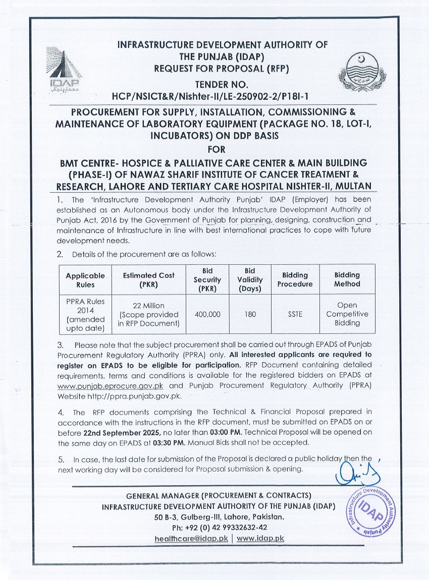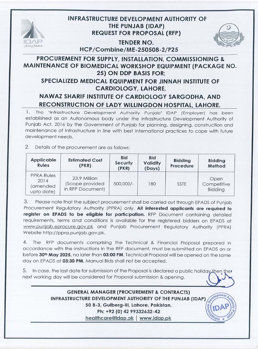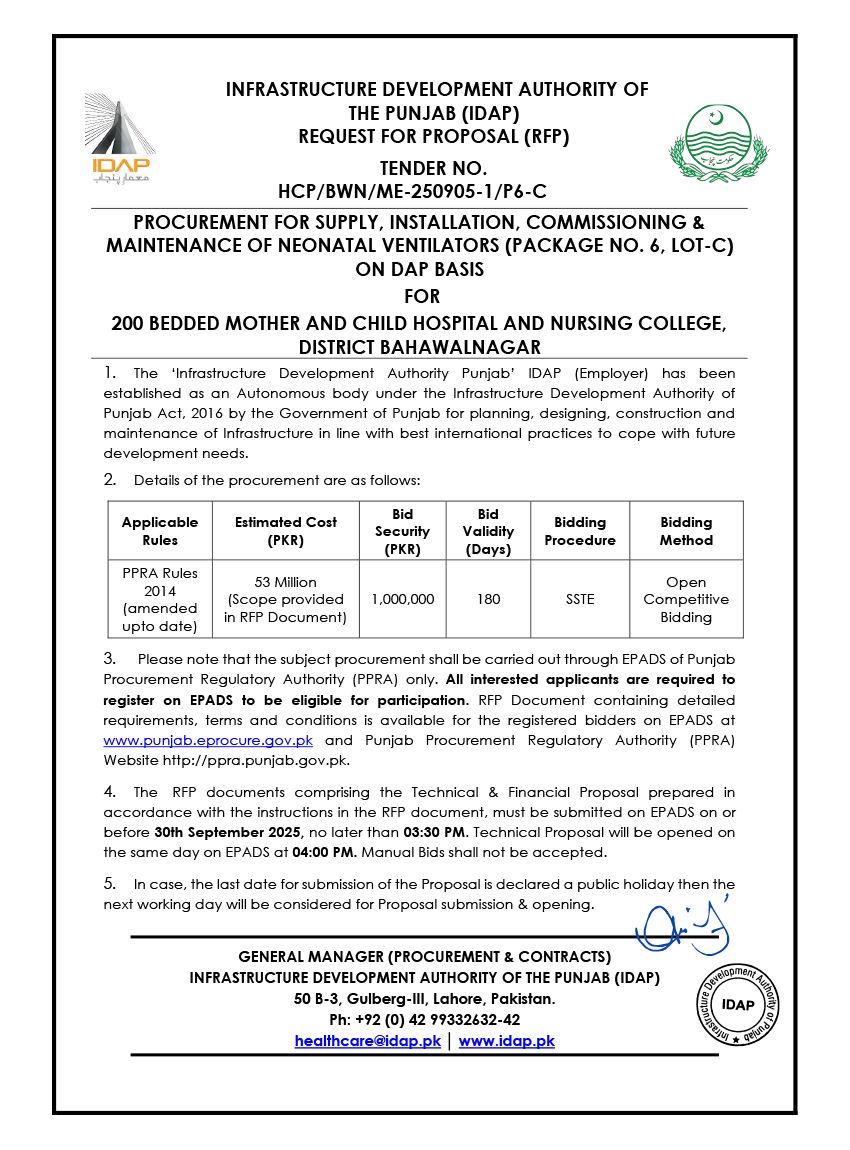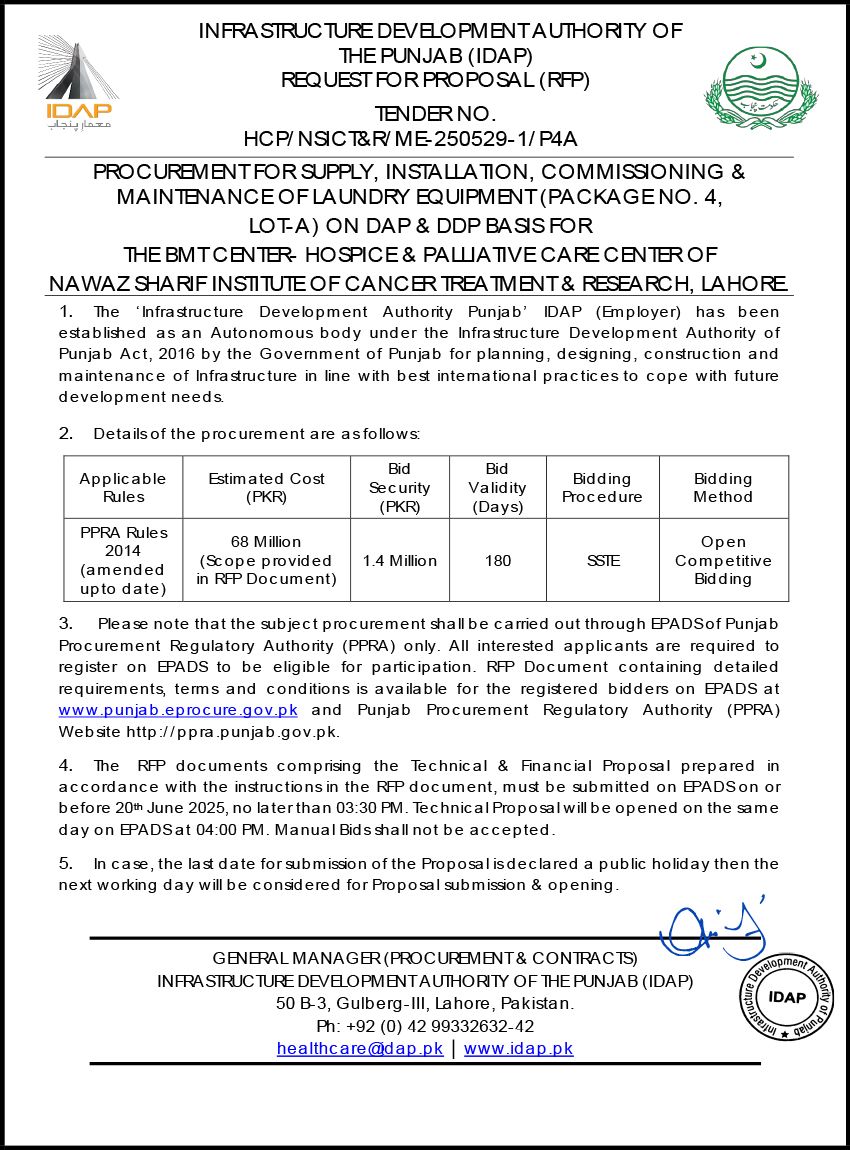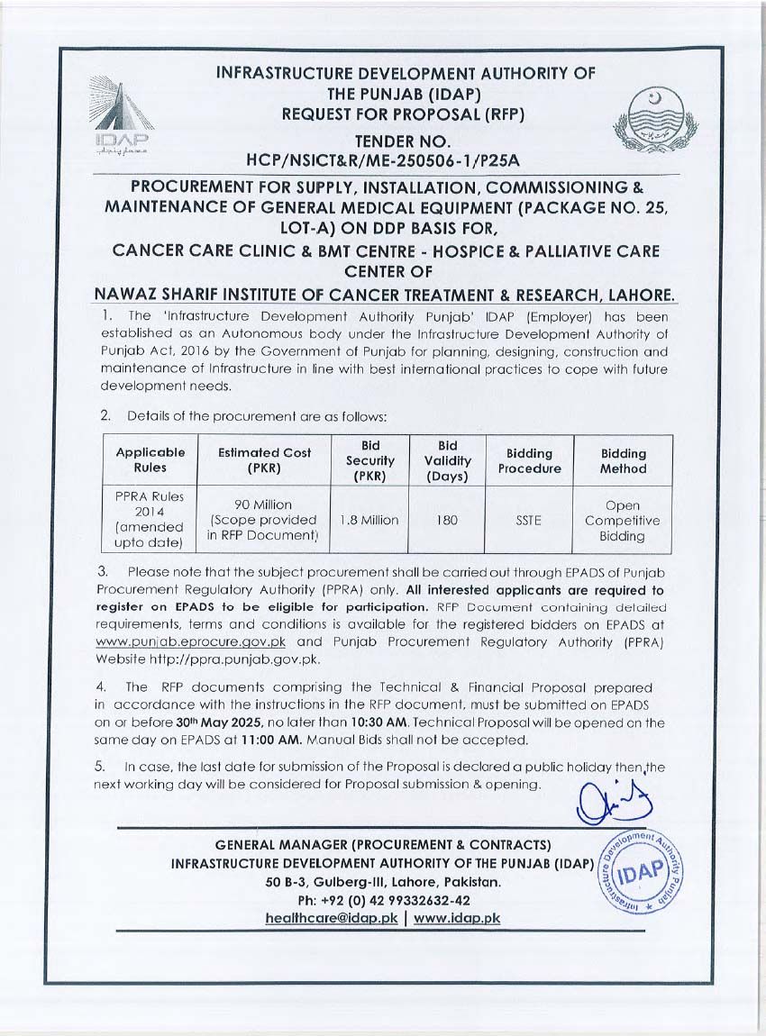 Supply, Installation, Commissioning & Maintenance of Various Medical Equipment For PKLI, Lahore