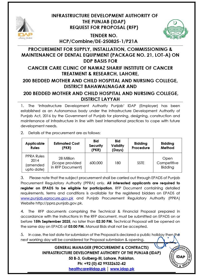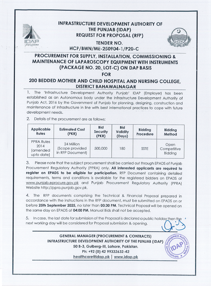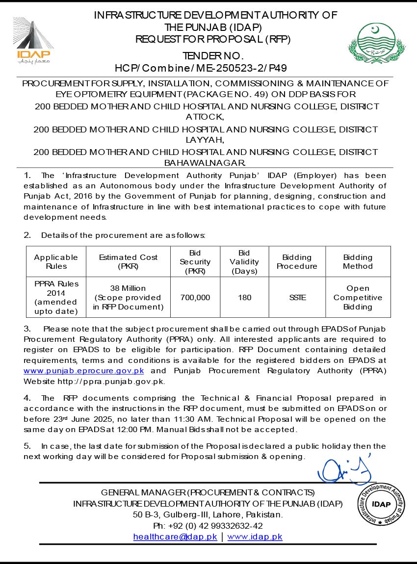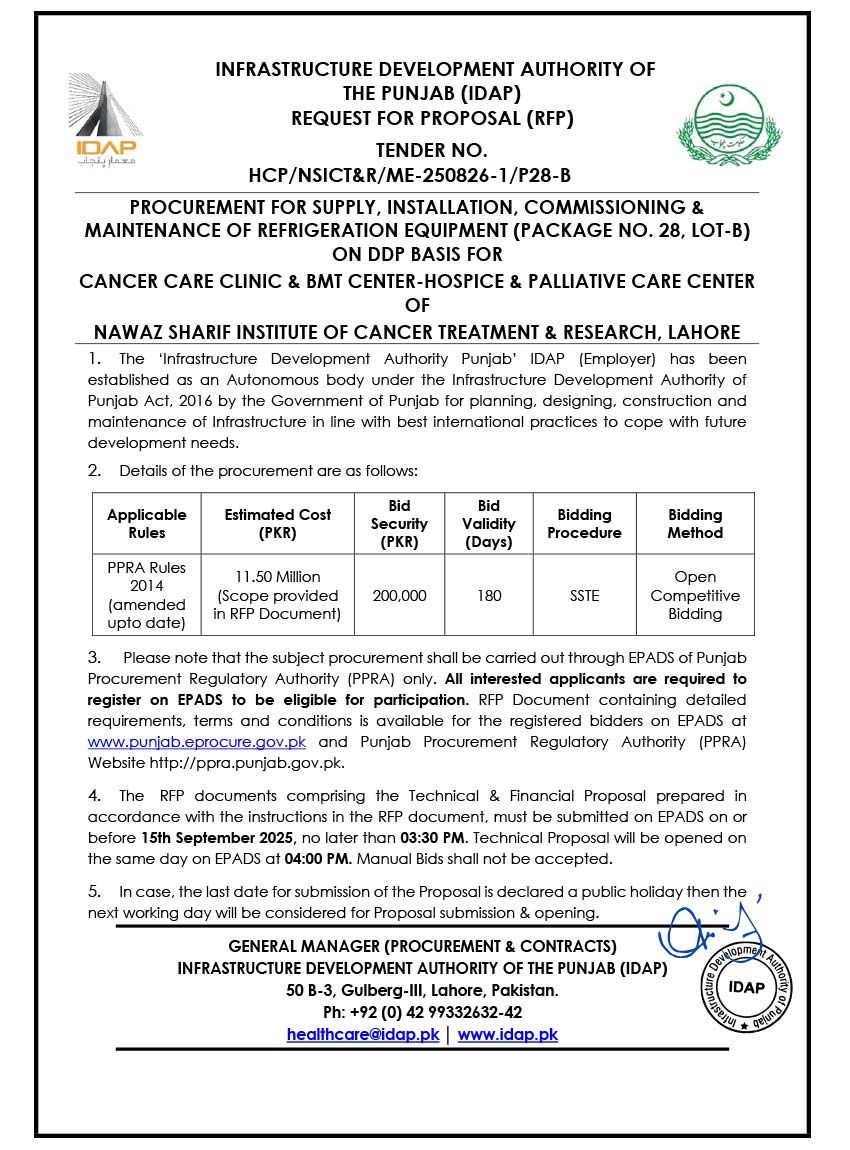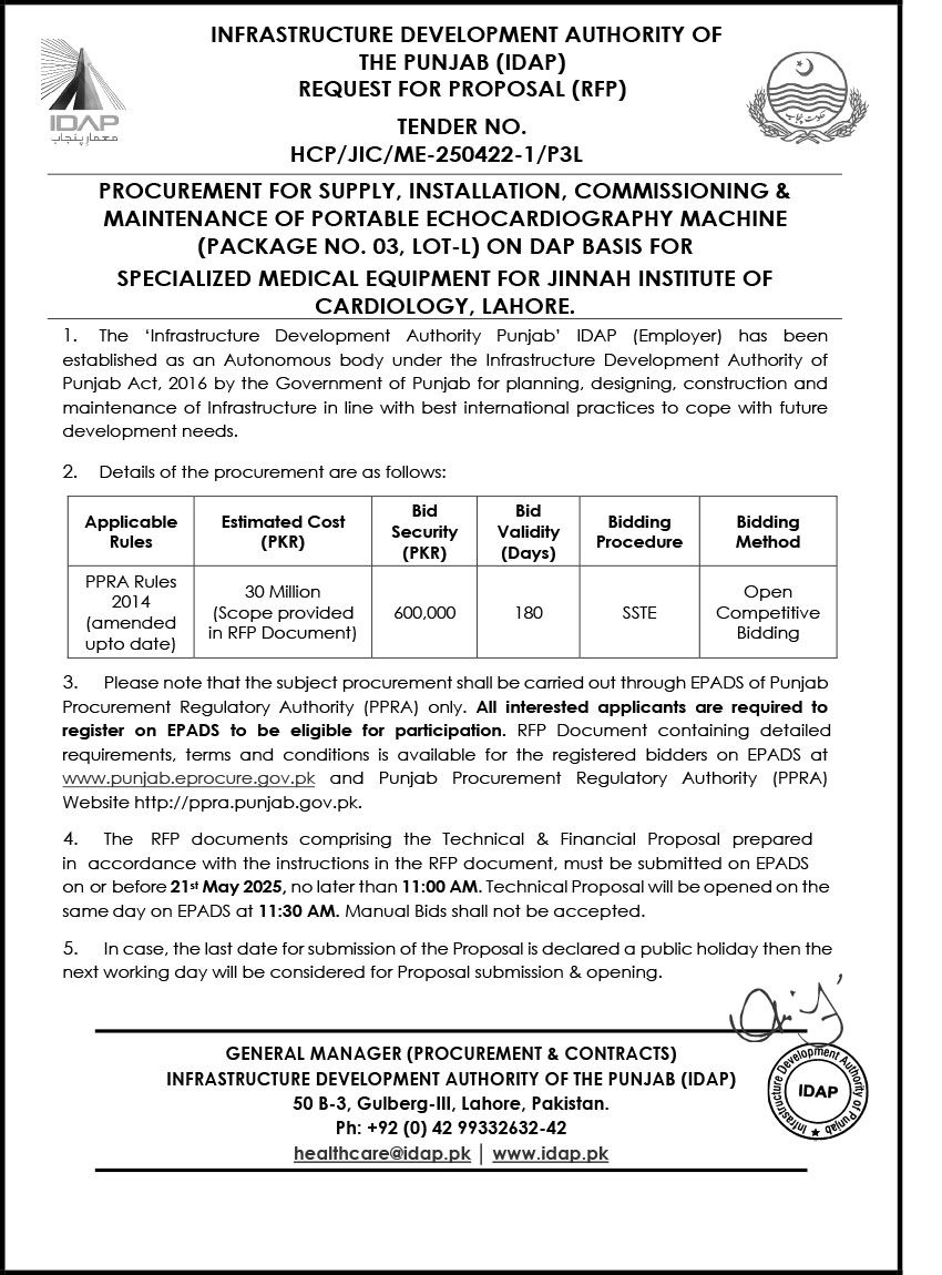 Supply, Installation, Commissioning & Maintenance of Various Medical Equipment For PKLI, Lahore