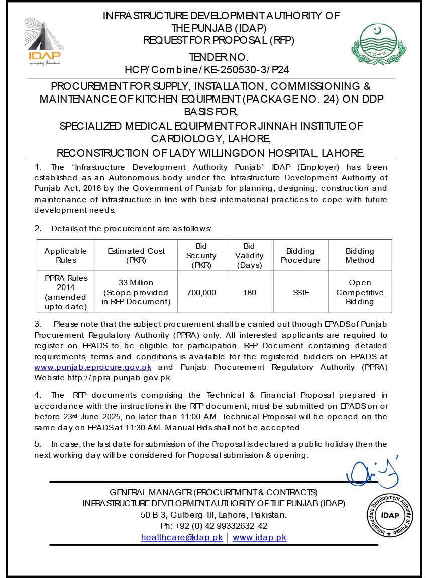 Kitchen Equipment (Package No. 24), for Specialized Medical Equipment for Jinnah Institute of Cardiology, Laho...
