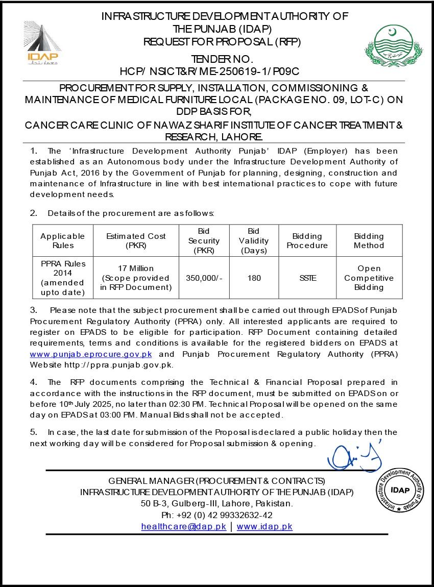 Medical Furniture Local (Package No. 09, Lot-C), for Cancer Care Clinic of Nawaz Sharif Institute of Cancer Tr...