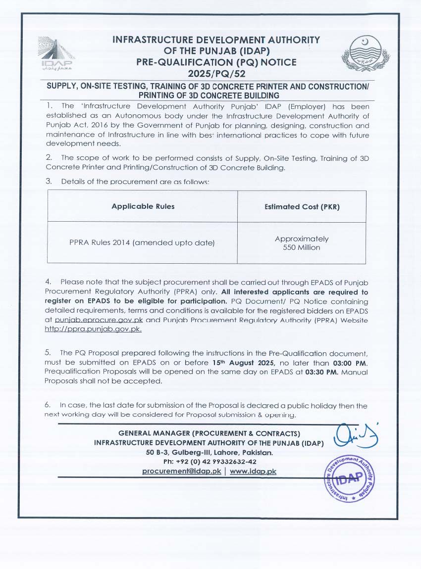 Supply, On-Site Testing, Training of 3D Concrete Printer And Construction/ Printing of 3D Concrete Building
