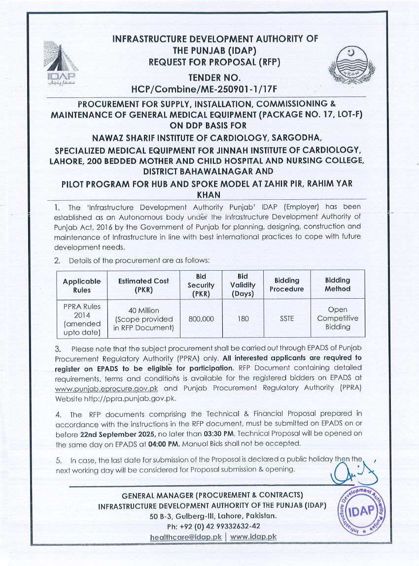 General Medical Equipment (Package No. 17, Lot-E), for Specialized Medical Equipment For JIC, Lahore - NSIC Sa...
