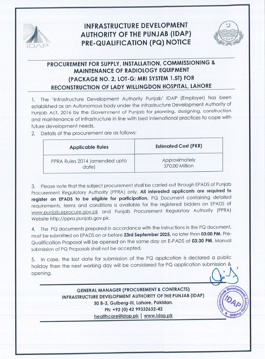 Package No. 2, Lot-G: MRI System 1.5Tesla for Reconstruction of Lady Willingdon Hospital, Lahore