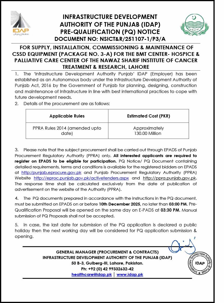 PQ CSSD Equipment (Package No. 3-A) for “The BMT Center-Hospice and Palliative Care Center of The Nawaz S...