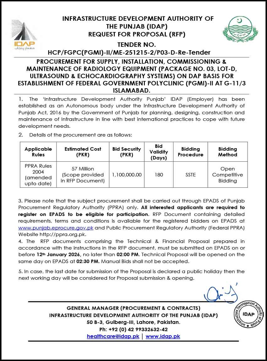 Temporary Pacemakers (Package No. 37, Lot-D) for “Establishment of 300-Bedded DHQ Hospital Mianwali.”