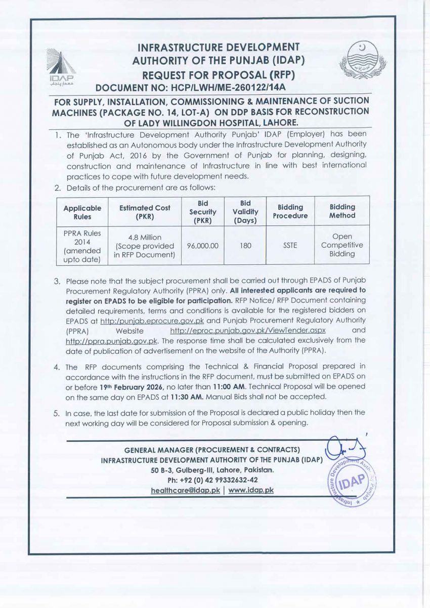 Suction Machines (Package No. 14, Lot-A) for "Reconstruction of Lady Willingdon Hospital, Lahore" (Tender Noti...