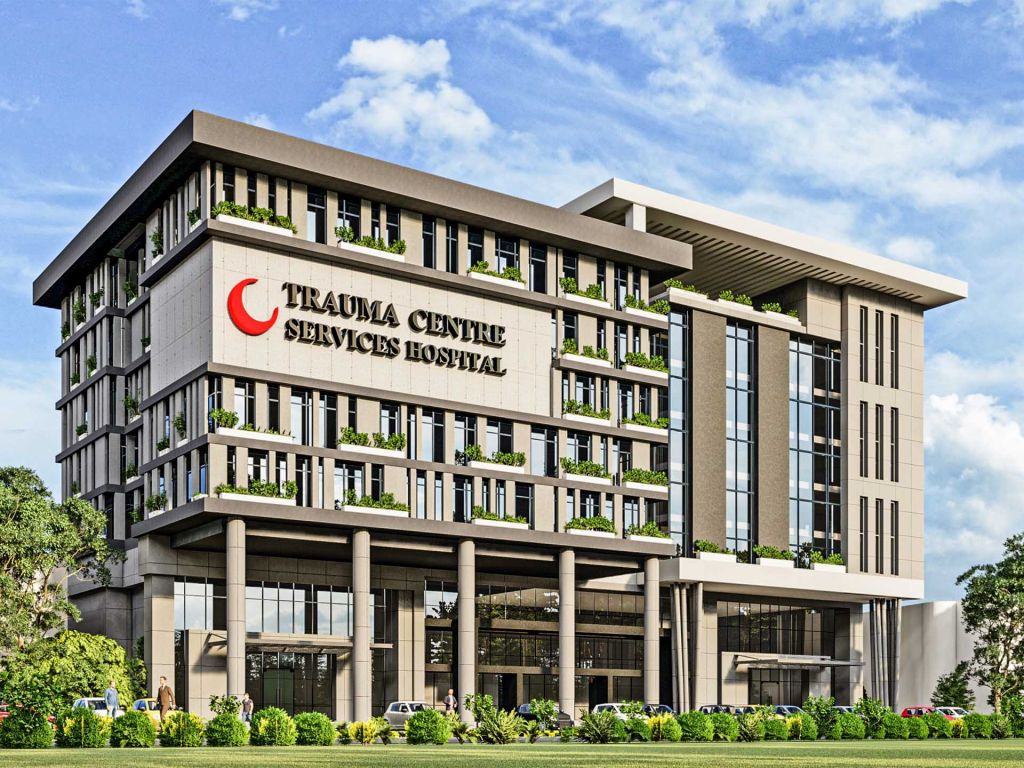 The Establishment of Emergency & Trauma Centre at Services Hospital, Lahore will comprise a bed strength of 180 bed dedicated Emergency and Trauma block having 10 levels proposed within the existing Services Hospital complex. The approximate covered area of the hospital is 204,377 sq. ft.